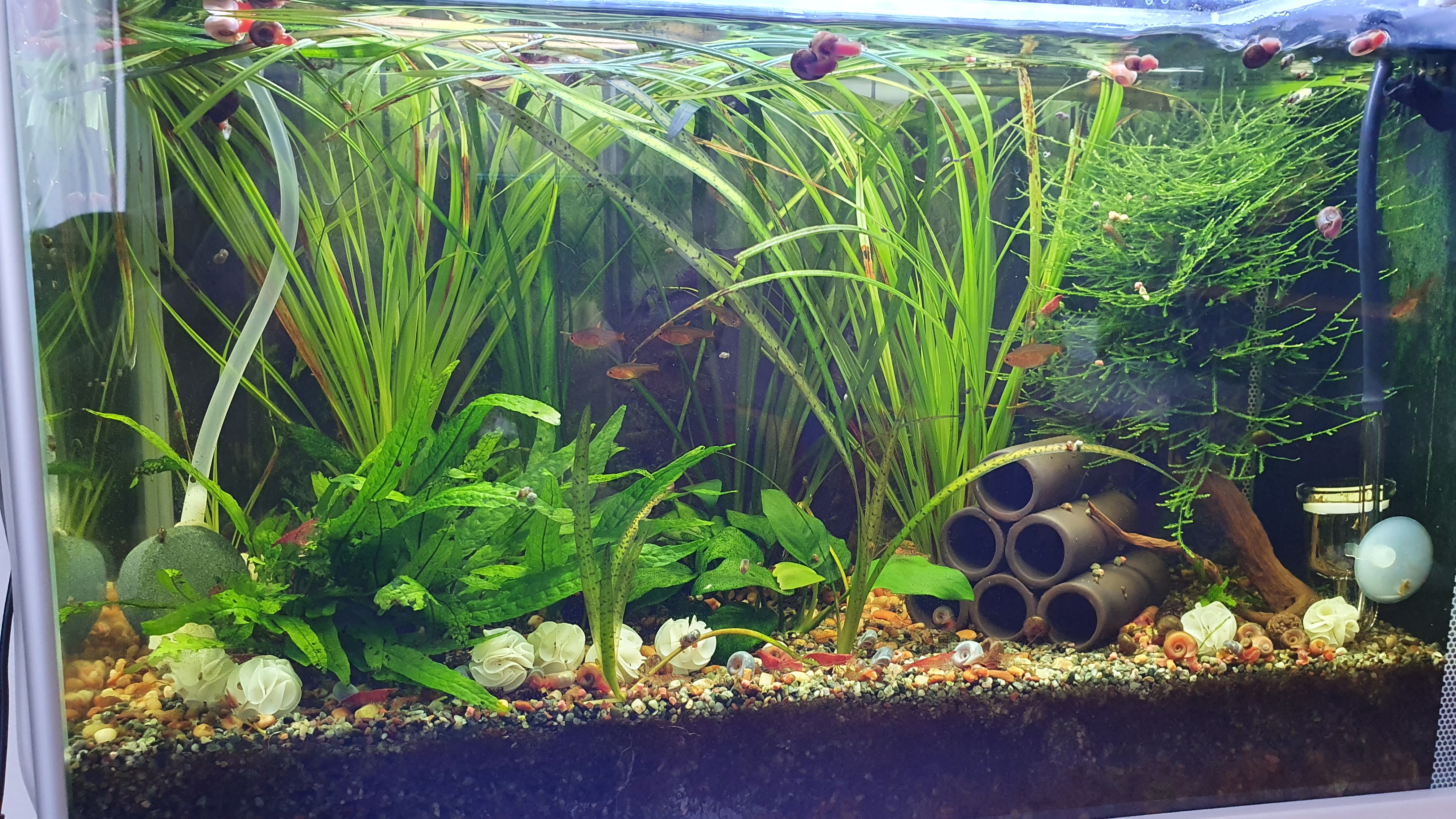 1 цм амьтны уртад 1 литер ус гэж тооцоход найдвартай. Мөн дундаж Температурыг би 23 градусаар дунджаар байлгахаар сонгов. Хайрга дор дэвсгэрээр болон үндэстэй ургамал тогтооход. Жавамоос гэх ургамлыг сам хорхой нуугдахад зориулан модонд бэхлэх (зураг дээр баруун гар талд сагсайж эхлэж байгаа). Анубиас хатуу навчтай бөгөөд үндэс нь бэхлэсэн болгонд барьцан ургадаг тул үндэс, мод ба чулуун дээр бэхлэхэд зүгээр (зураг дээр дунд хэсэгт). Зүүн гар талд Жавафарныг мөн л сам хорхой нуугдац болгох зорилготой тус тус ургамалуудыг суулгалаа.